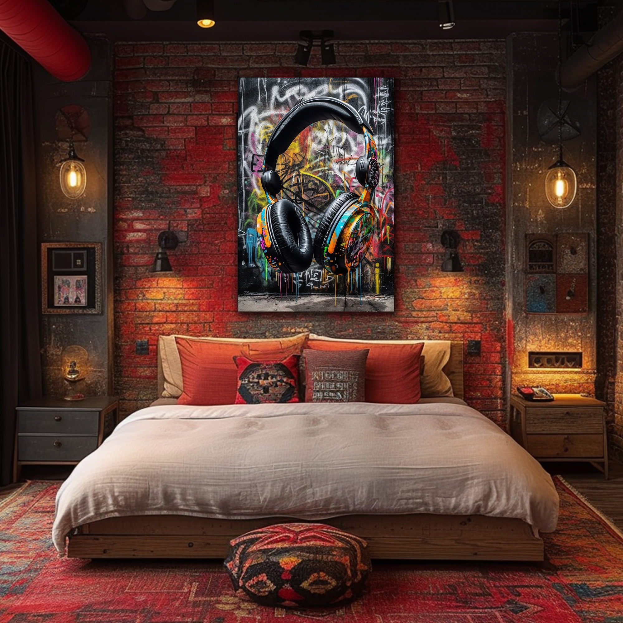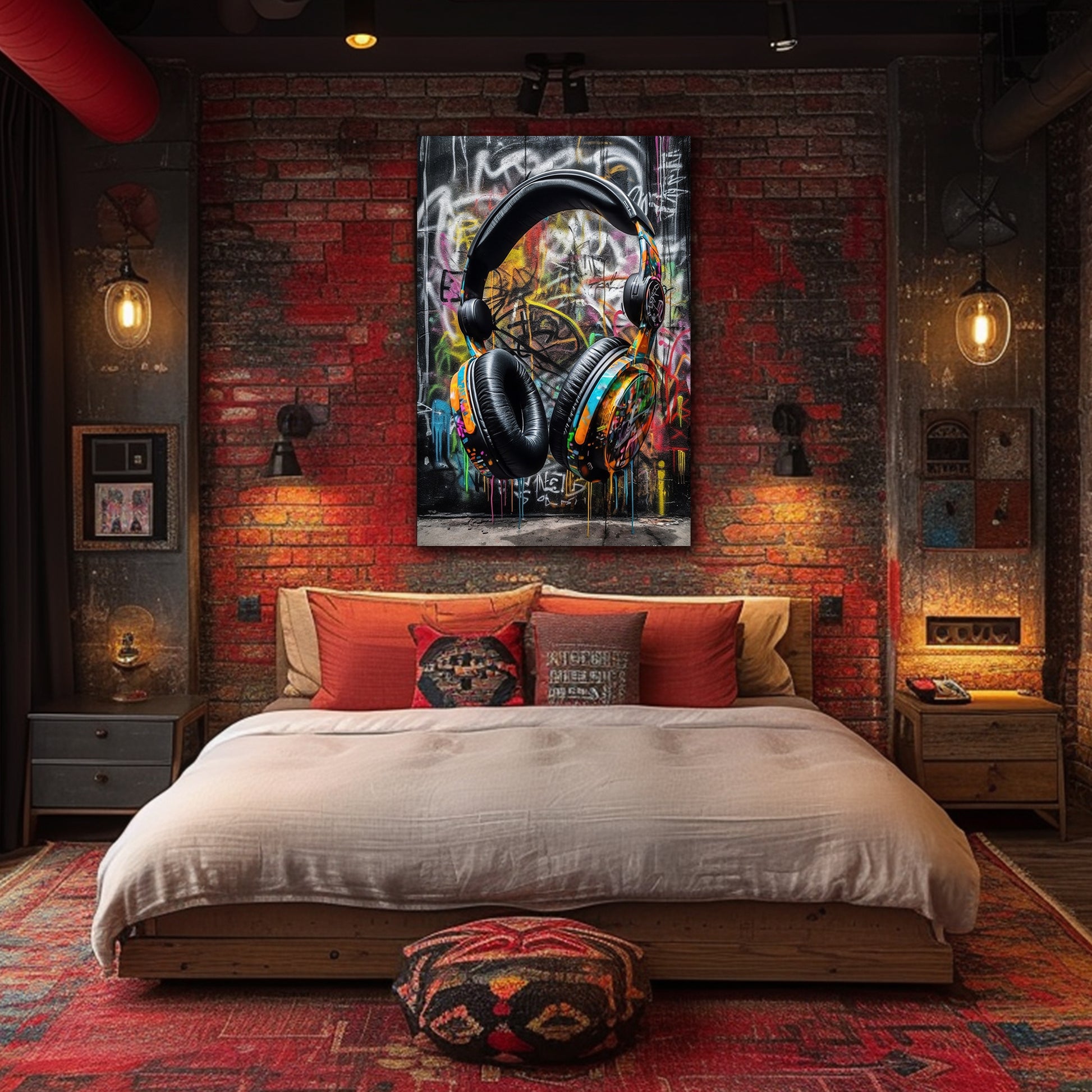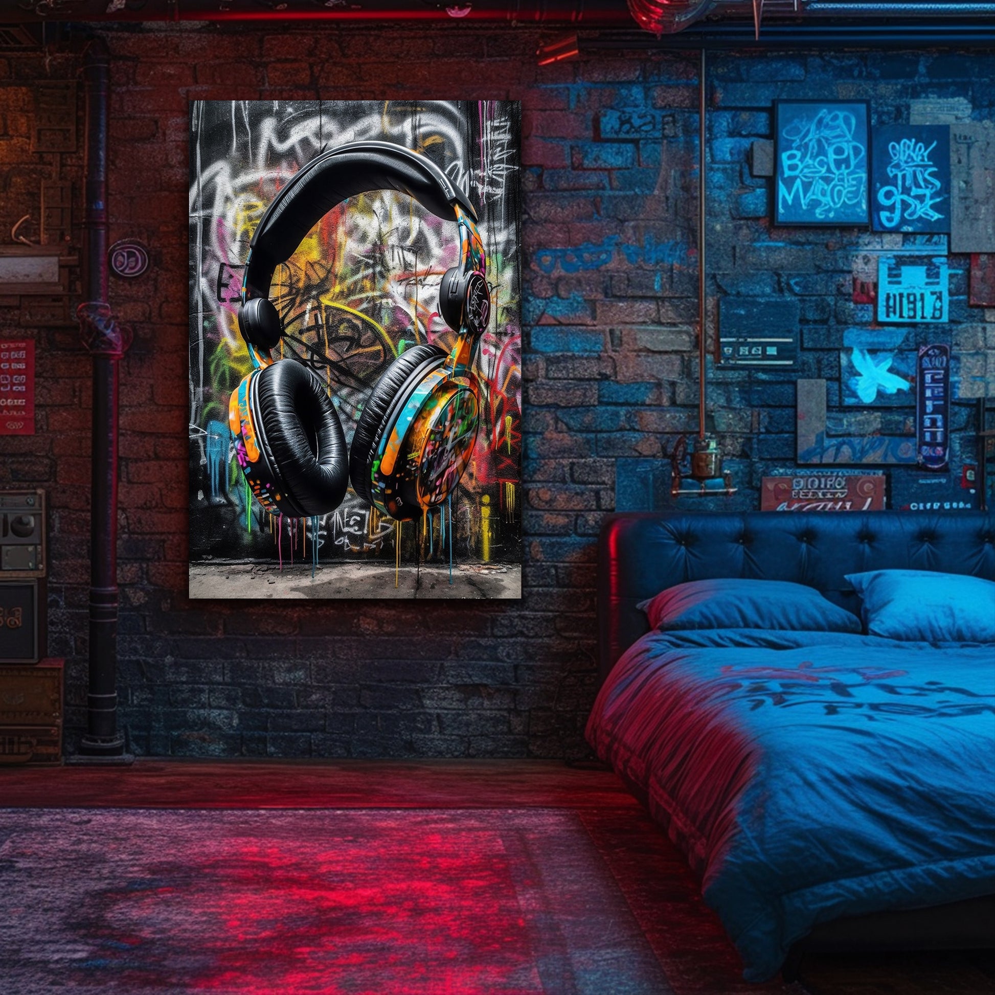 1.5" Thick Pine Frame Graffiti Headphones Art Print - Vibrant Urban DJ Poster, Retro Music Wall Decor, Modern Street Digital Pop Art for Teen Men, Kid, Gamer Bedroom Room Decor - Unique Abstract Design, High-Quality Print, Re