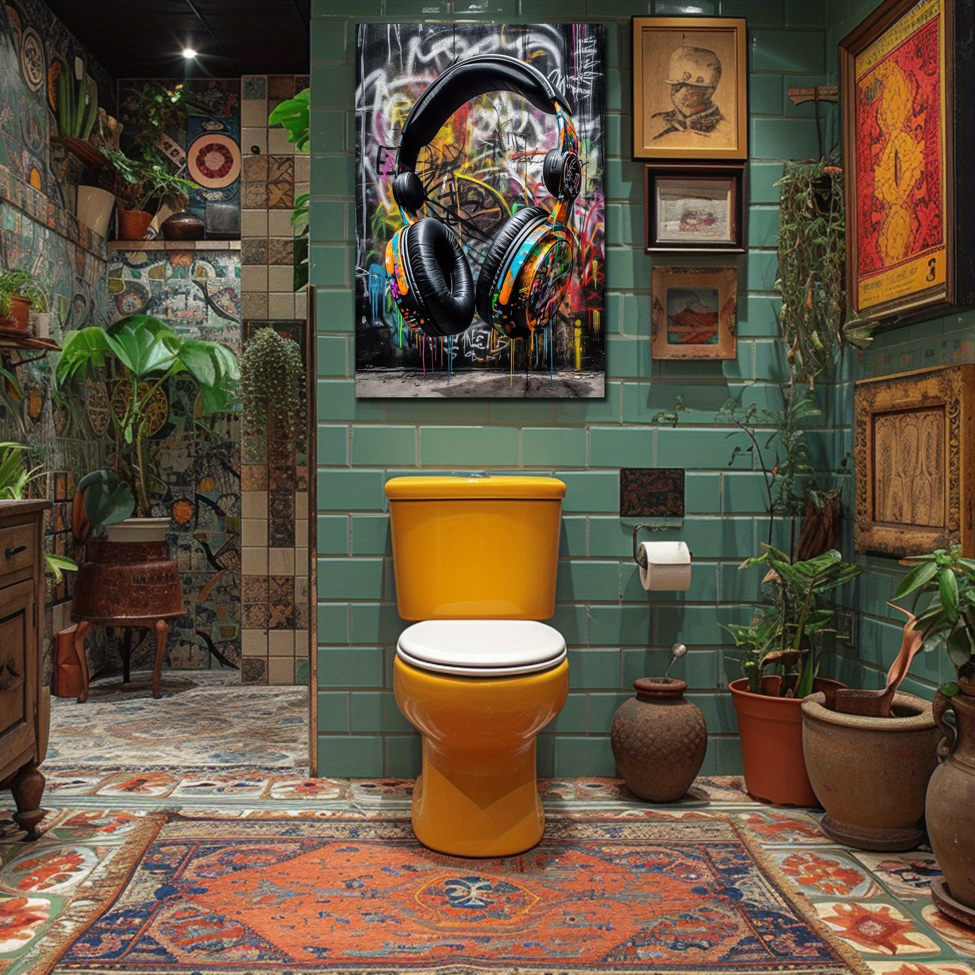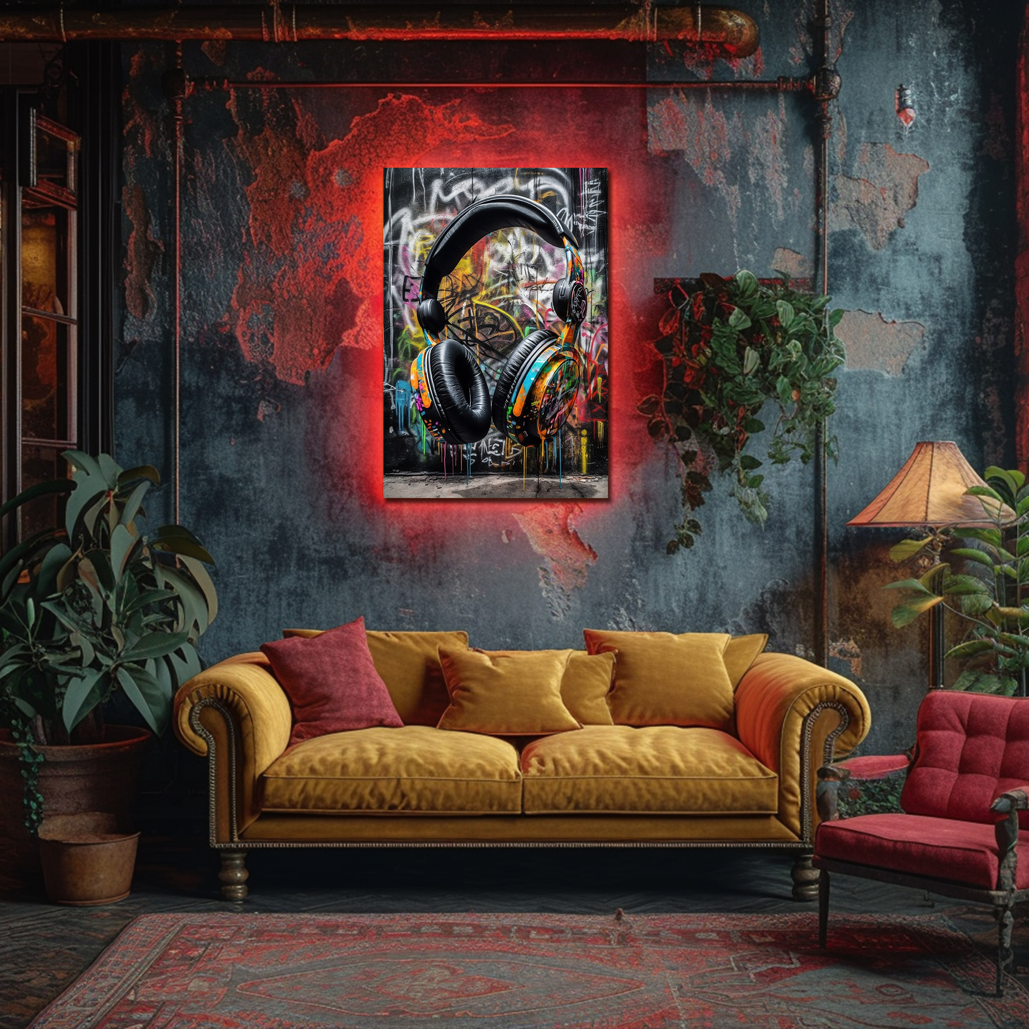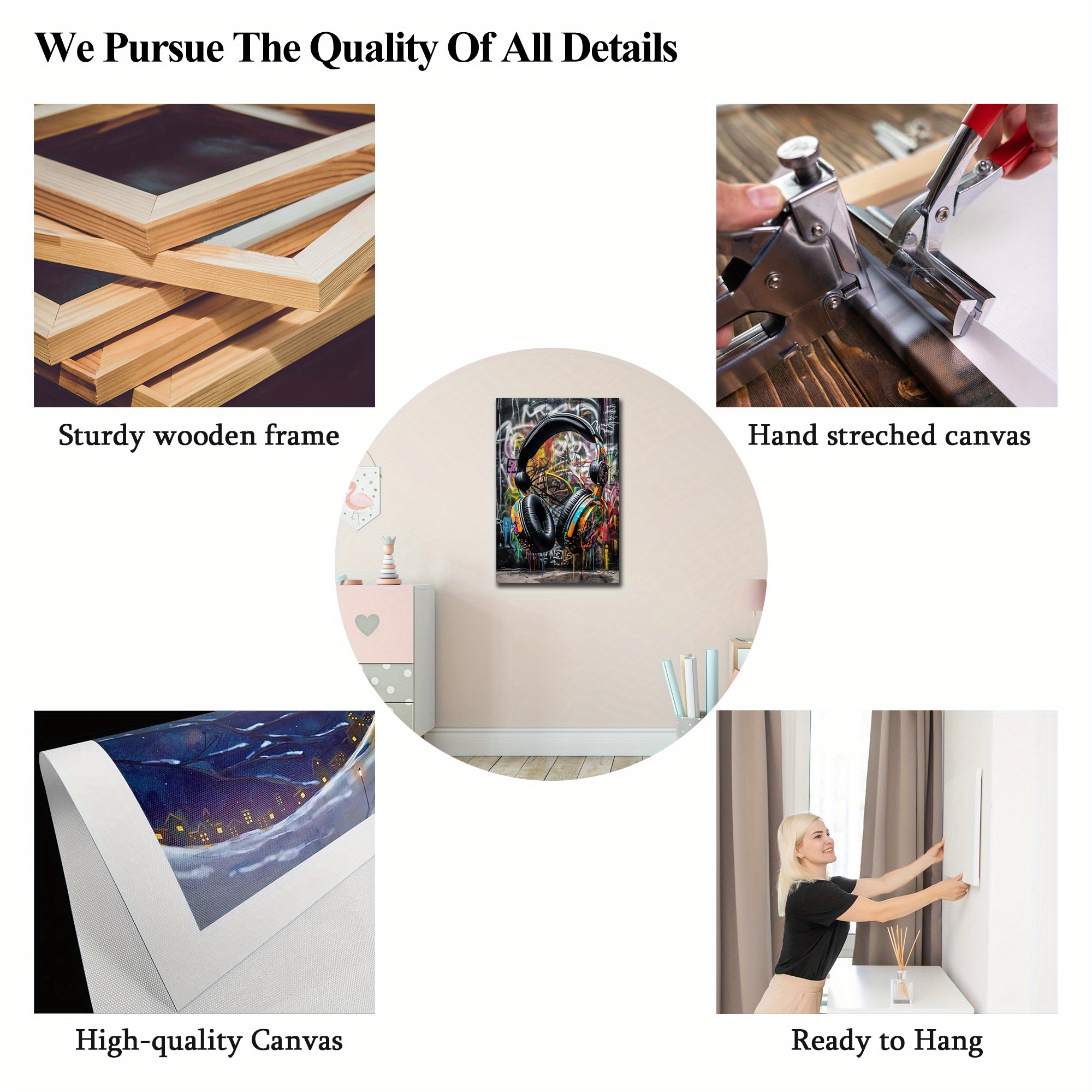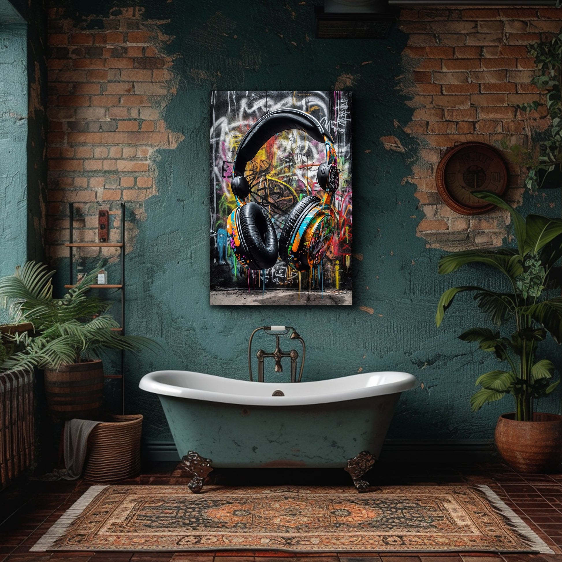 1.5" Thick Pine Frame Graffiti Headphones Art Print - Vibrant Urban DJ Poster, Retro Music Wall Decor, Modern Street Digital Pop Art for Teen Men, Kid, Gamer Bedroom Room Decor - Unique Abstract Design, High-Quality Print, Re