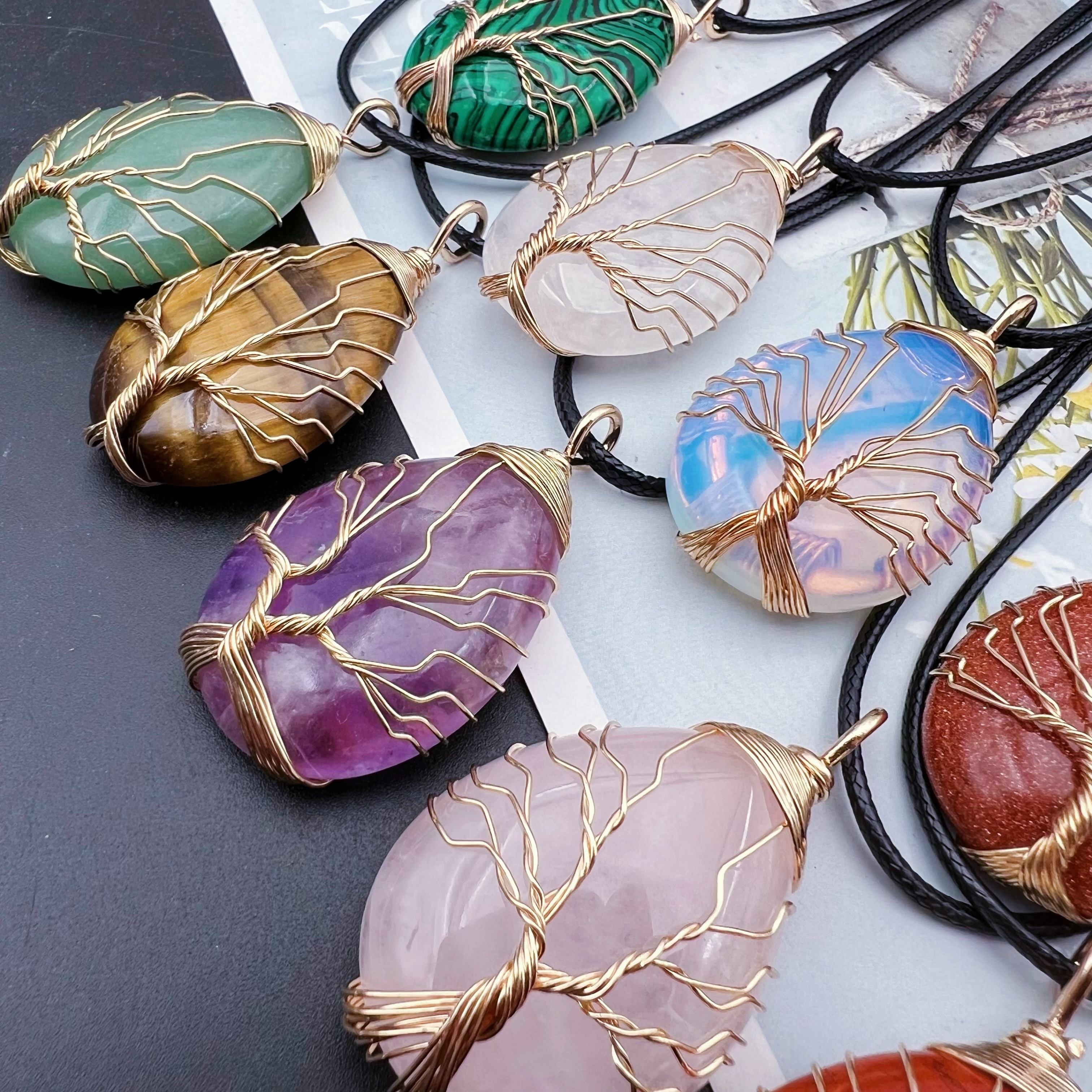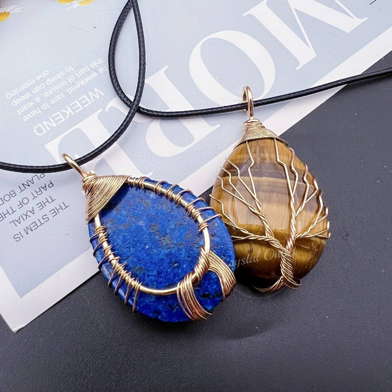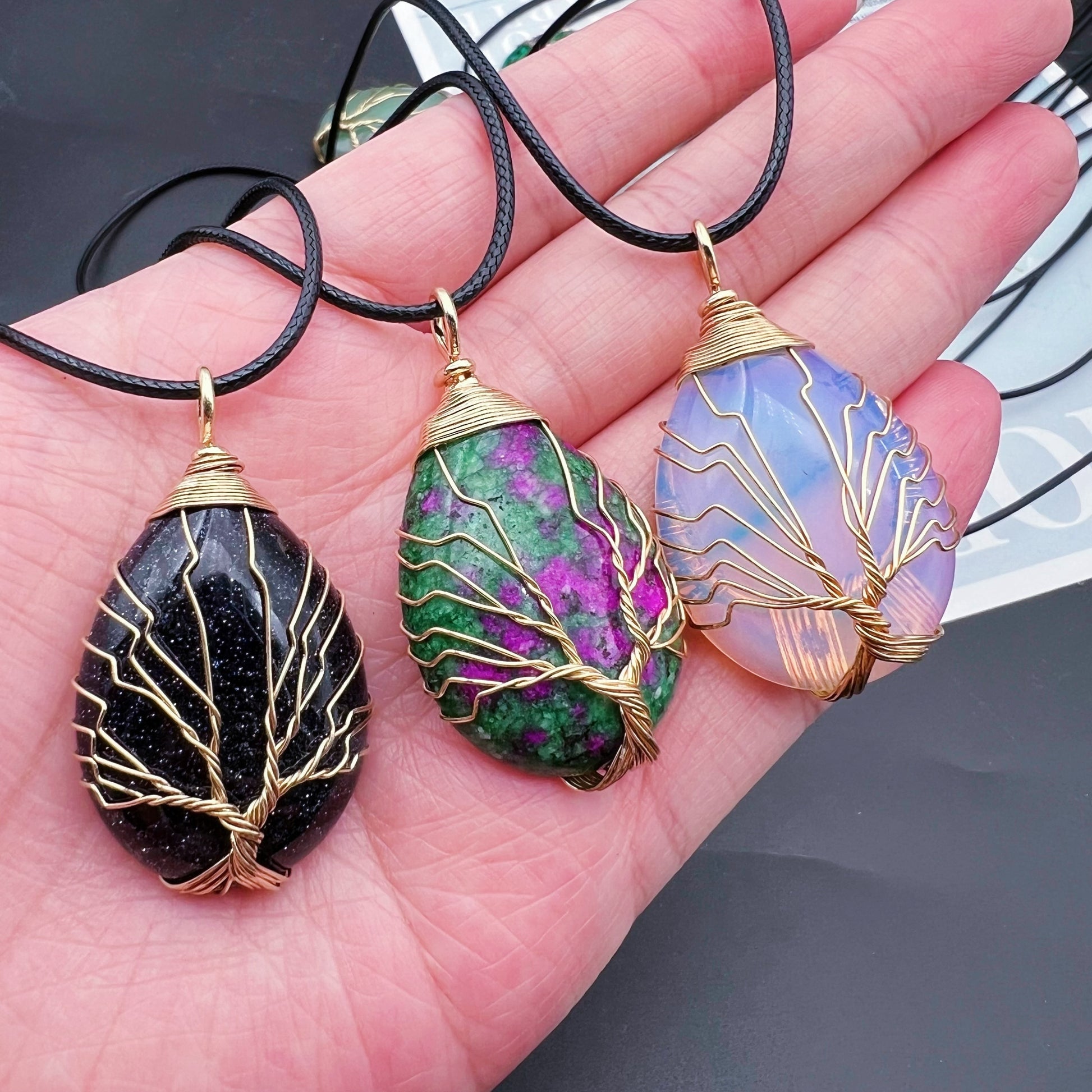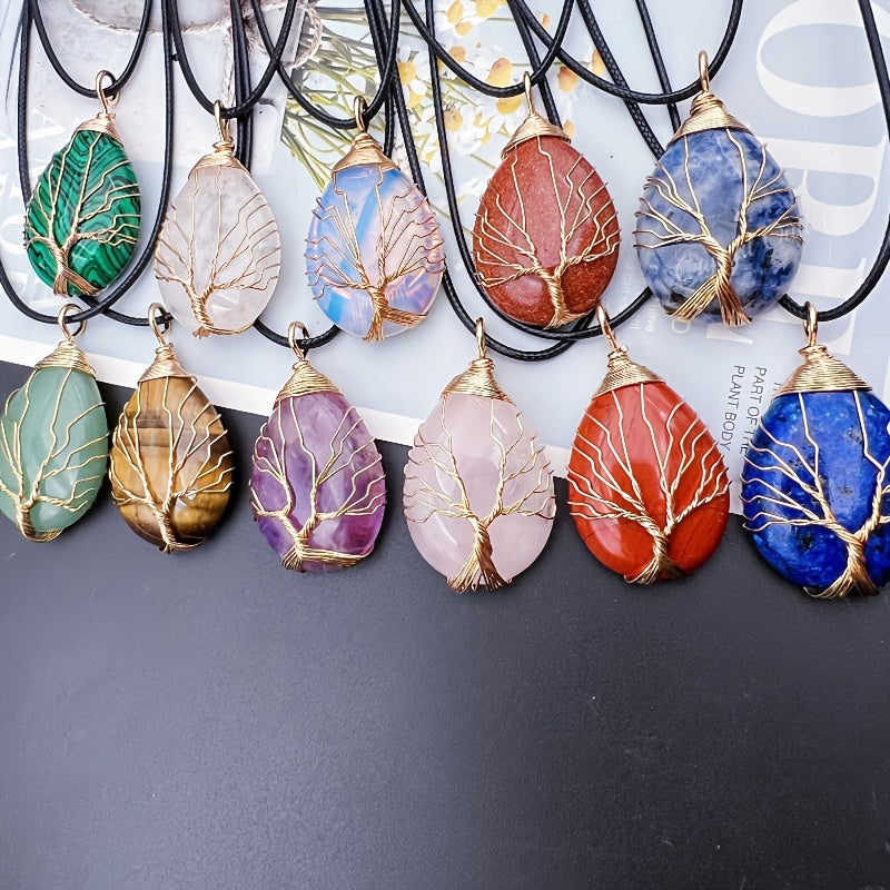 1pc Natural Crystal Droplet Cooper Tree Of Life Charm Pendant Necklace, Black Faux Leather Chakra Gemstone Jewelry Gifts For Women Men