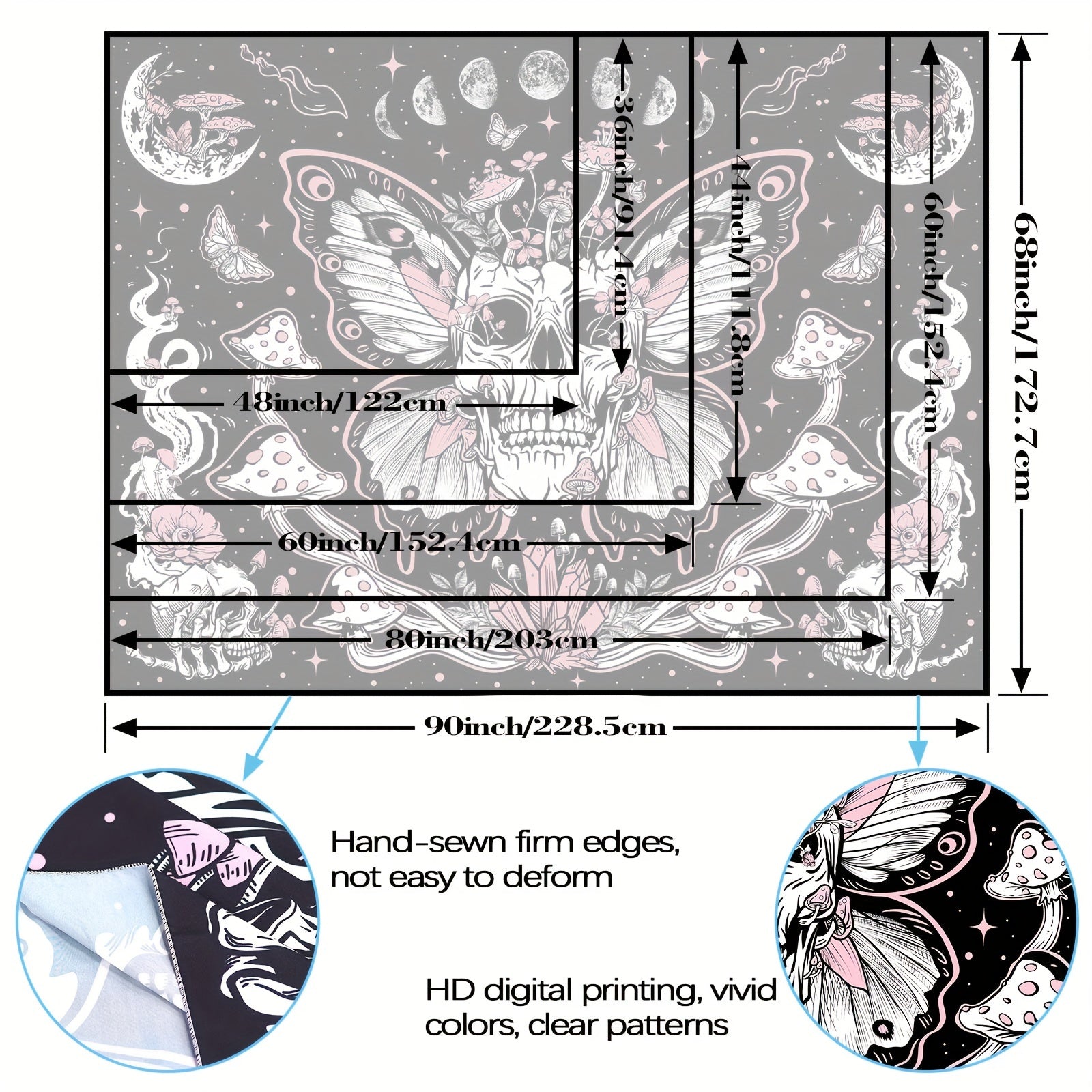This hippie art tapestry will be a great decoration to your bedroom, featuring unique elements such as spooky skulls, butterflies, mushrooms and botanical flowers, embellished with moon phases and stars, symbolizing darkness, death and rebirth.