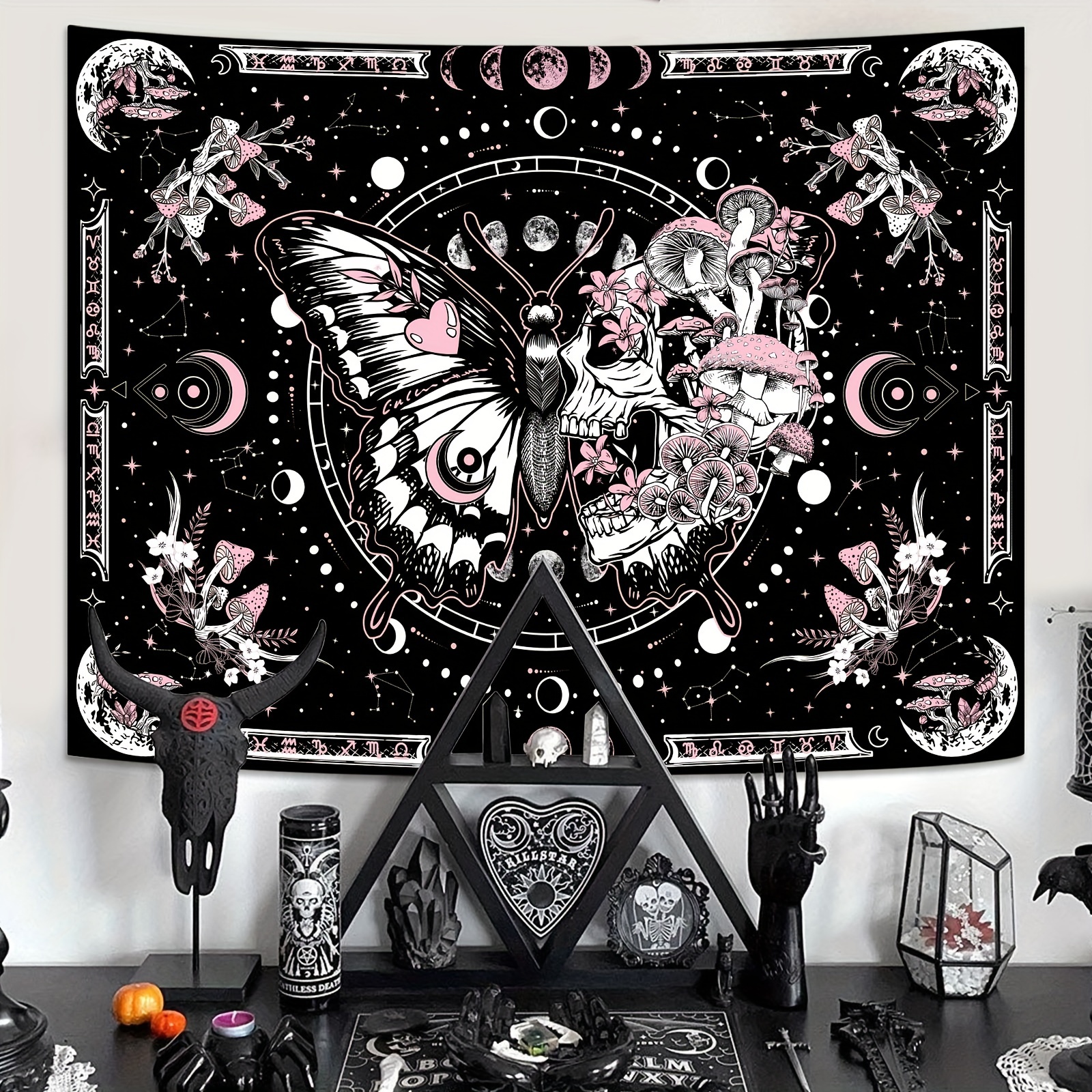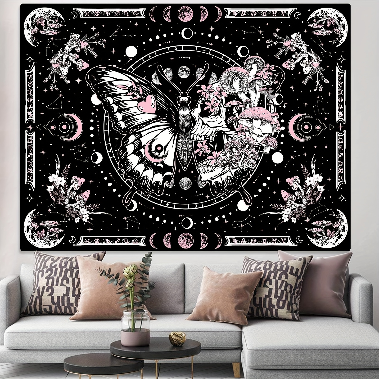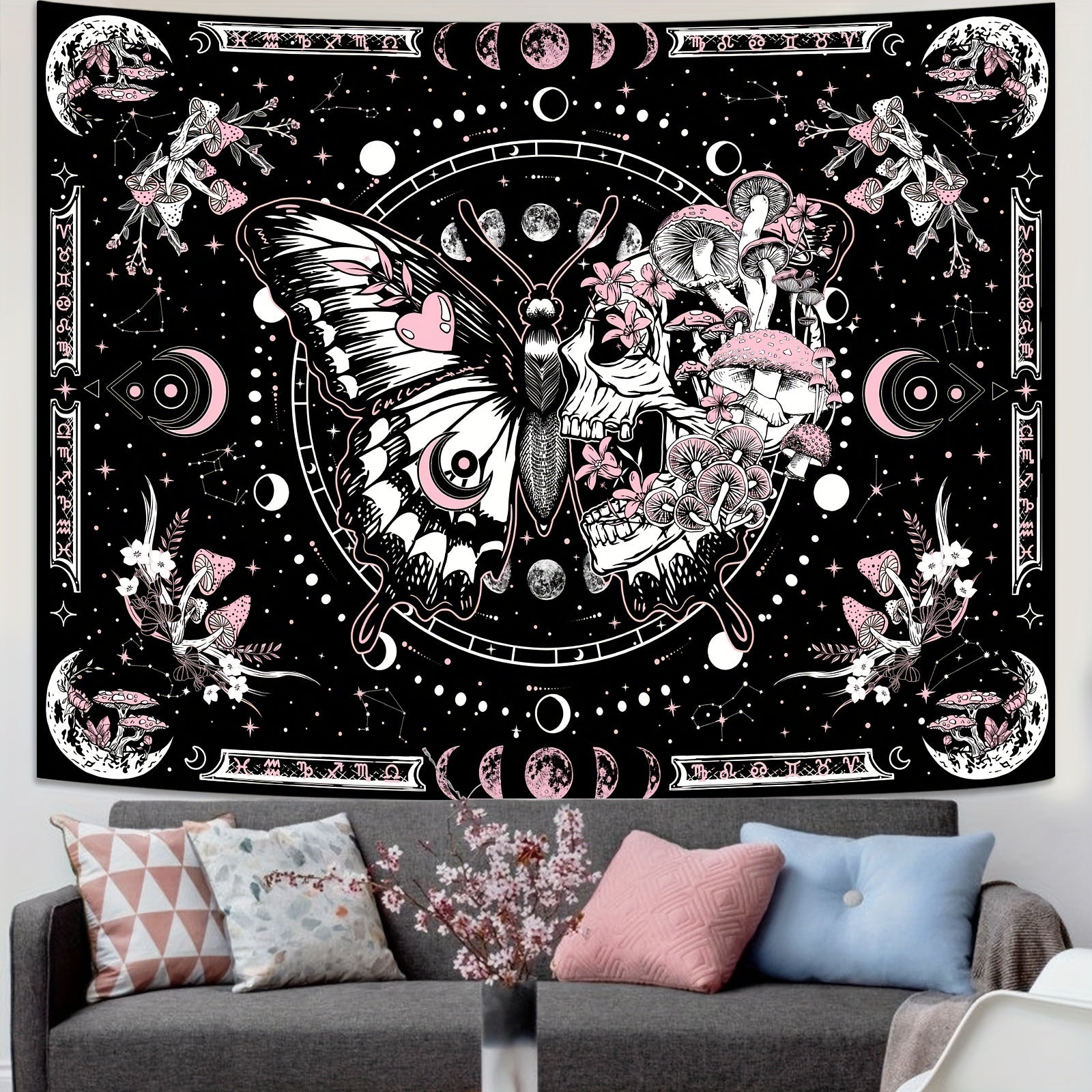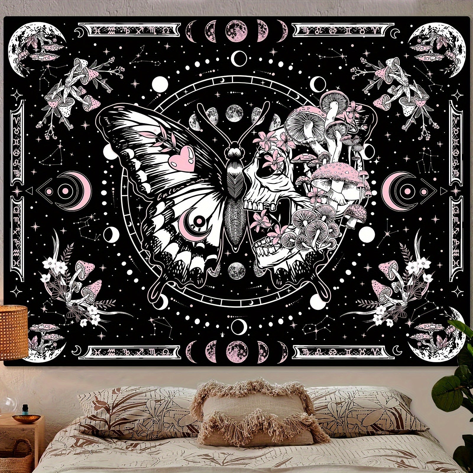 Skull Butterfly Tapestry Pink Skull Hippie Mushroom Plant Bedroom Tapestry Moon Phase Aesthetic Tapestry Living Room Dormitory Wall Hanging Tapestry Pink)