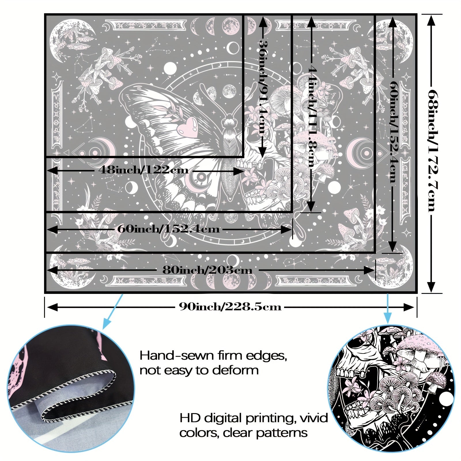 This skull mushroom tapestry not only adds to the visual appeal of the room, but also serves as a backdrop for various activities. It can be used as wall decoration, ceiling decoration, university dormitory decoration, bed covers, curtains, picnic MATS, beach blankets, tablecloths, etc. It also can be given as a gift to relatives, friends and lovers. The beautiful butterfly and mysterious skeleton mushroom design seamlessly blends elegance and mystery, and it's sure to take your home decor to th